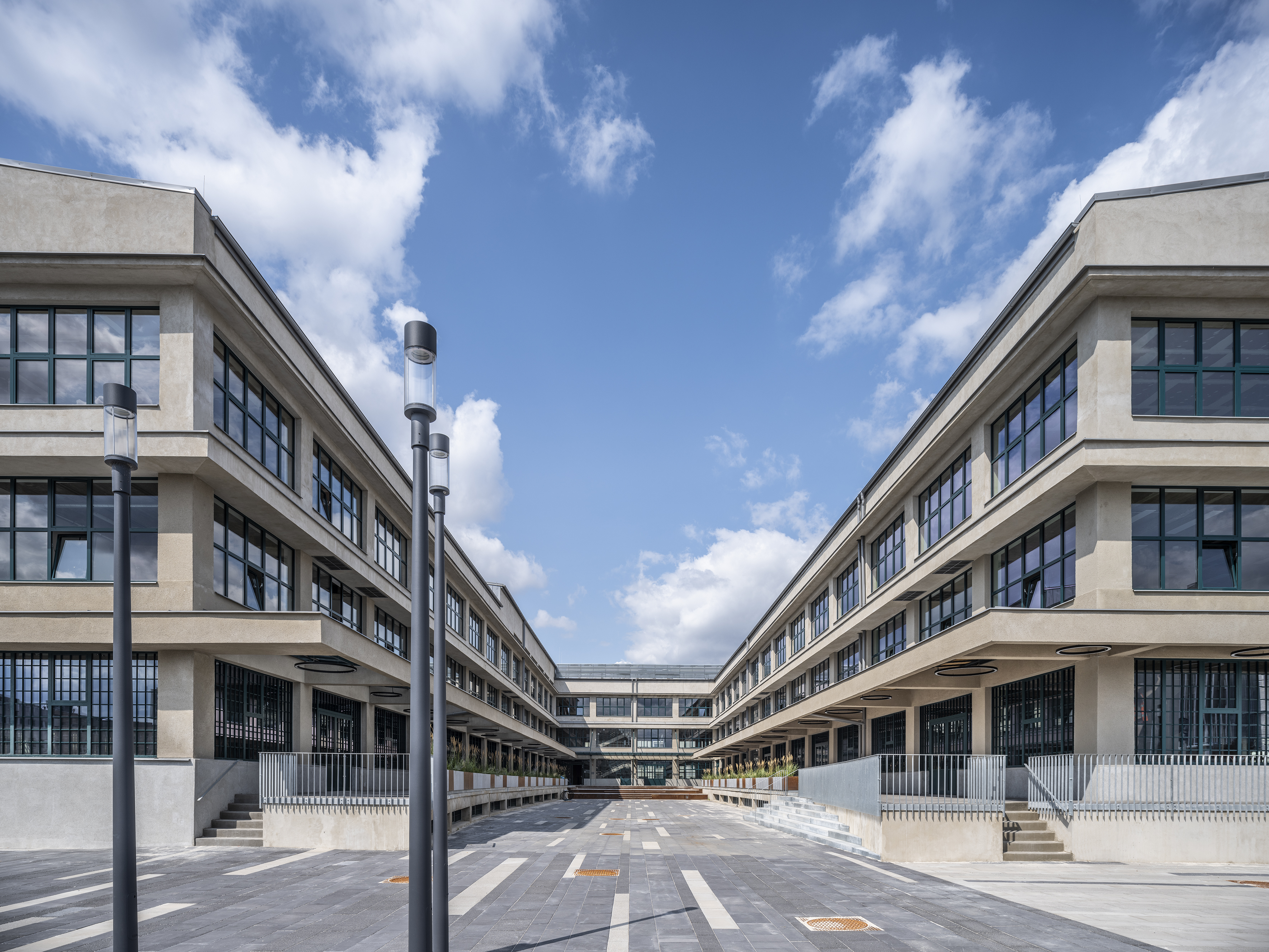Rozsáhlá budova ve tvaru písmene E na více než 27 000 m2 nabízí efektivní propojení industriální architektury s velkorysým prostorem pro galerie a ateliéry, kulturní a sportovní akce, obchodní jednotky, kavárny a restaurace, stejně jako variabilní kanceláře či sdílená pracovní místa.